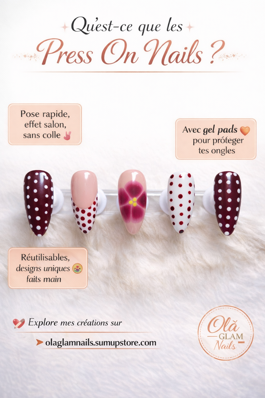 Les Press On Nails sont des faux ongles réutilisables, conçus pour offrir une manucure parfaite en quelques minutes, sans rendez-vous en salon.